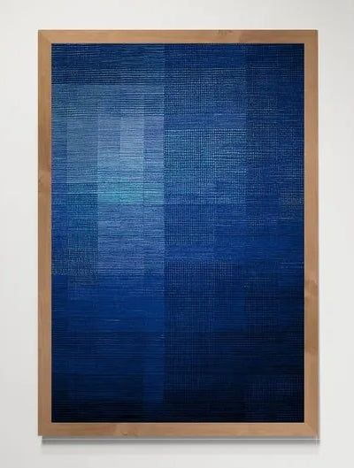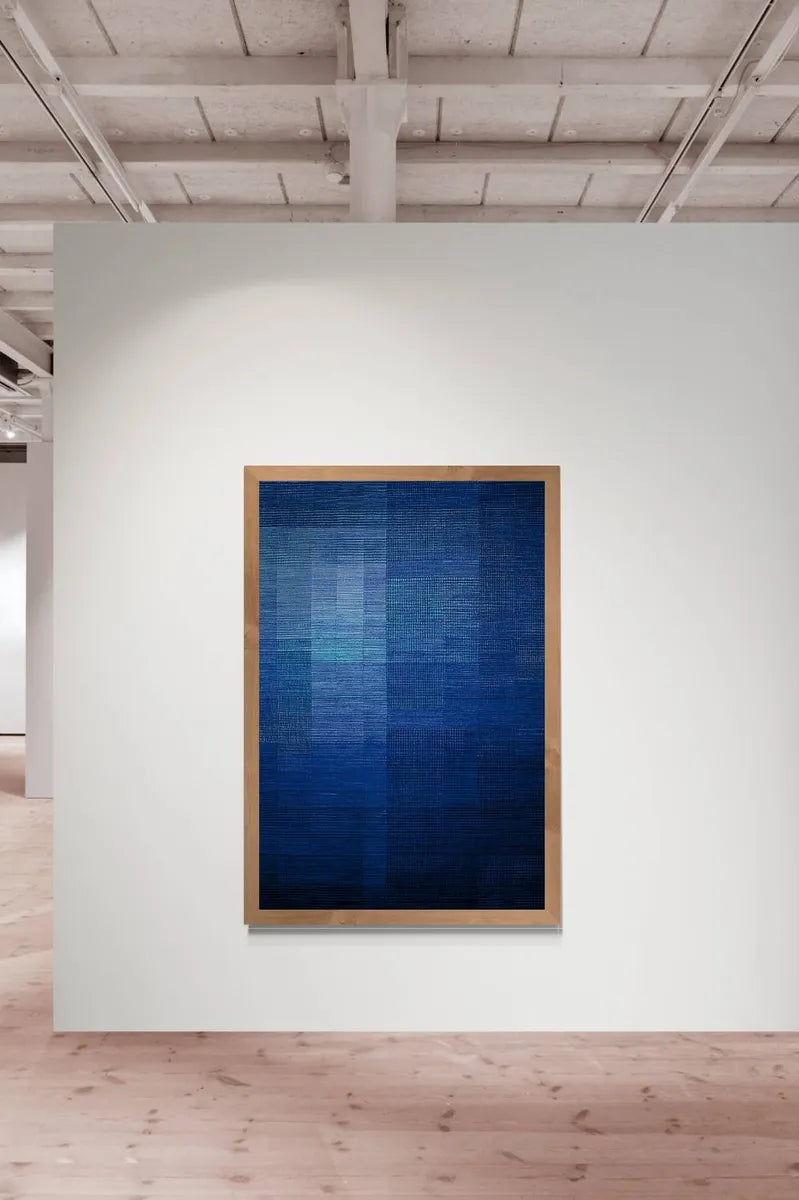 De vävda tonerna skiftar sakta mellan block, fält och skuggor. På nära håll framträder garnets struktur, på håll blir väven en monokrom målning i textil. Verket bär på stillhet, men också kraft – ett blått andetag för väggen.