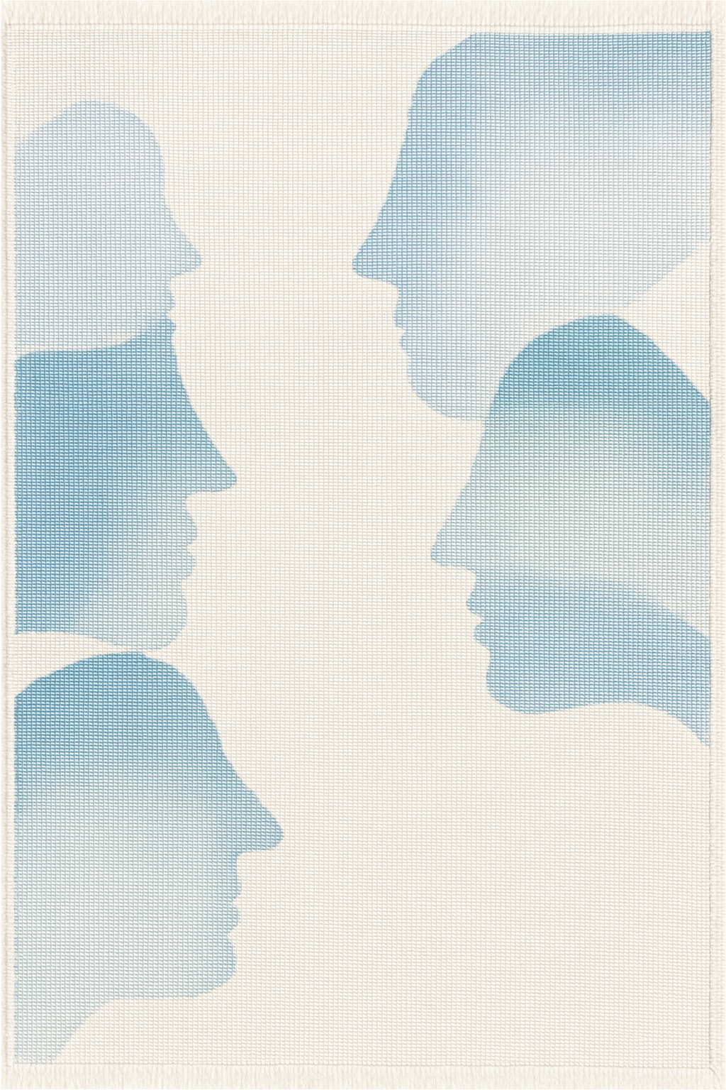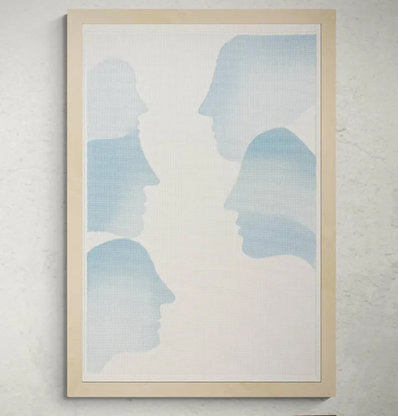 I det vävda verket "Sidebyside" möts fyra ansikten i ett tyst samtal – vävda i dimblå nyanser mot en ljus, nästan transparent fond. Silhuetterna svävar i luften som tankar i rörelse, i en komposition som uppmuntrar till kontemplation och närvaro.