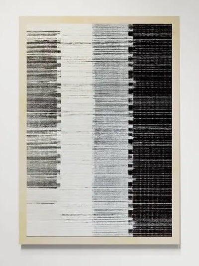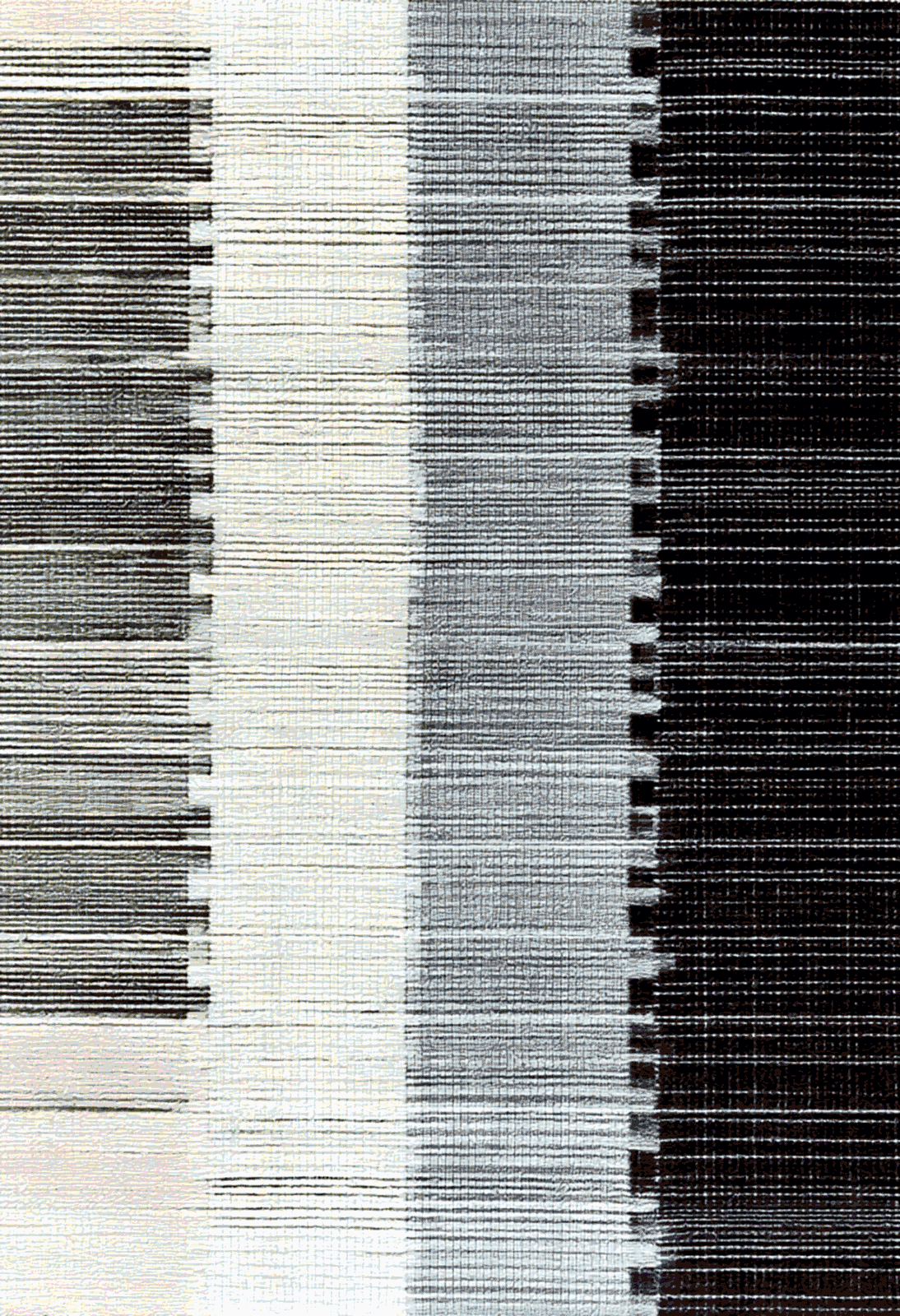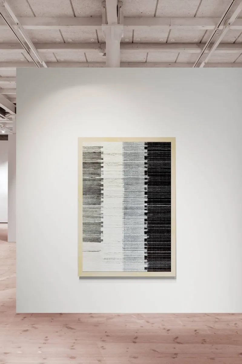 Det svartvita formspråket förstärker kontrasten mellan struktur och tomrum, och gör verket till ett starkt grafiskt inslag i både offentliga och privata miljöer. Väven är tekniskt exakt men samtidigt levande – varje tråd bär på en vibration, ett skifte, en puls.