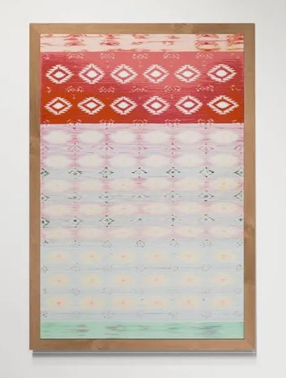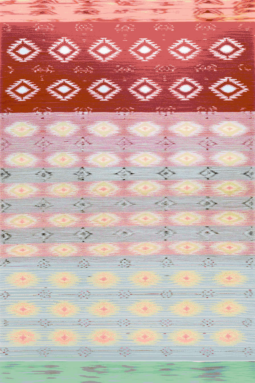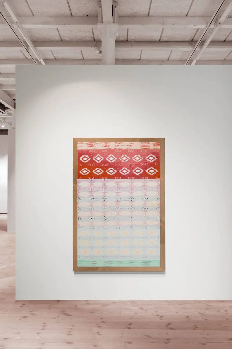 "Leksand" är ett vävt verk som börjar med tydliga, traditionella mönster i rött och vitt – likt klassiska textilier från Mellanöstern eller Latinamerika – men där formerna gradvis löses upp. Mot slutet förvandlas de till färgslöjor, punkter och fält som nästan suddas ut i blågrått och grönt.