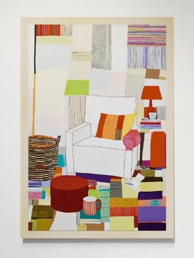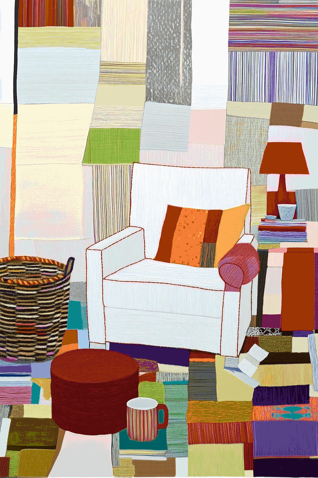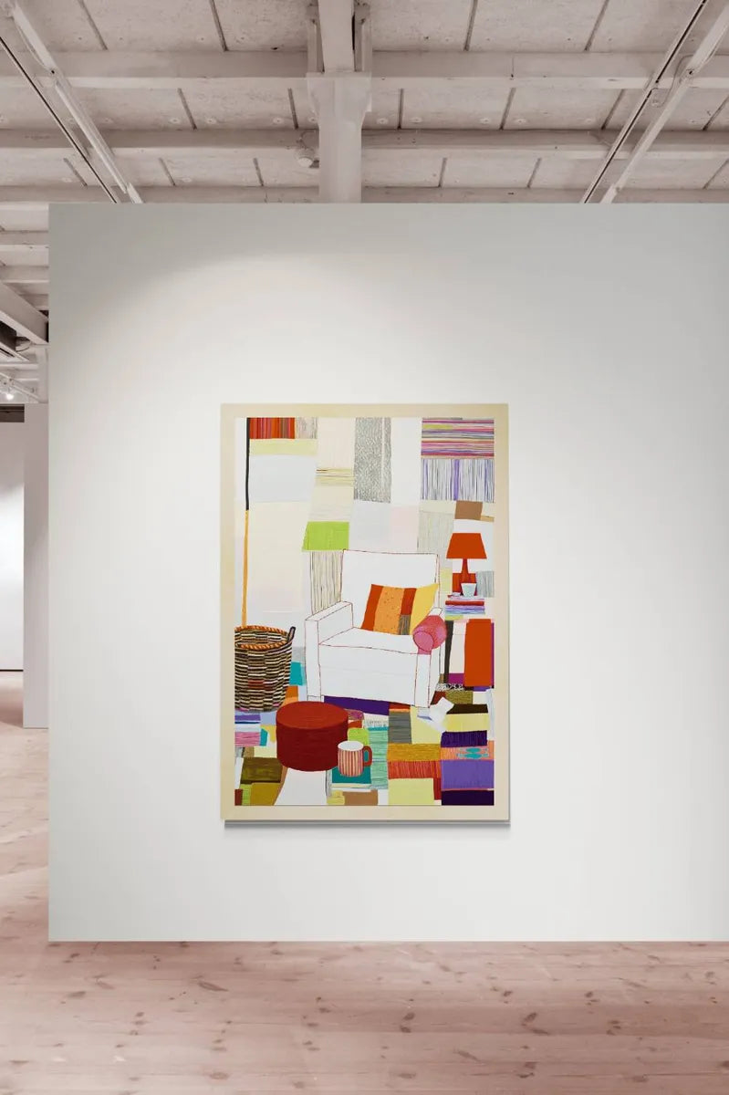 "Läsfåtöljen" är ett varmt och inbjudande vävt verk som fångar ögonblicket innan dagen börjar – eller efter att den tagit slut. En vit fåtölj står i centrum, omgiven av bokhögar, en kopp, en stickkorg och lapptäcksliknande väggar och golv. Motivet är samtidigt konkret och stiliserat, där färgfälten skapar en känsla av både struktur och mjukhet.